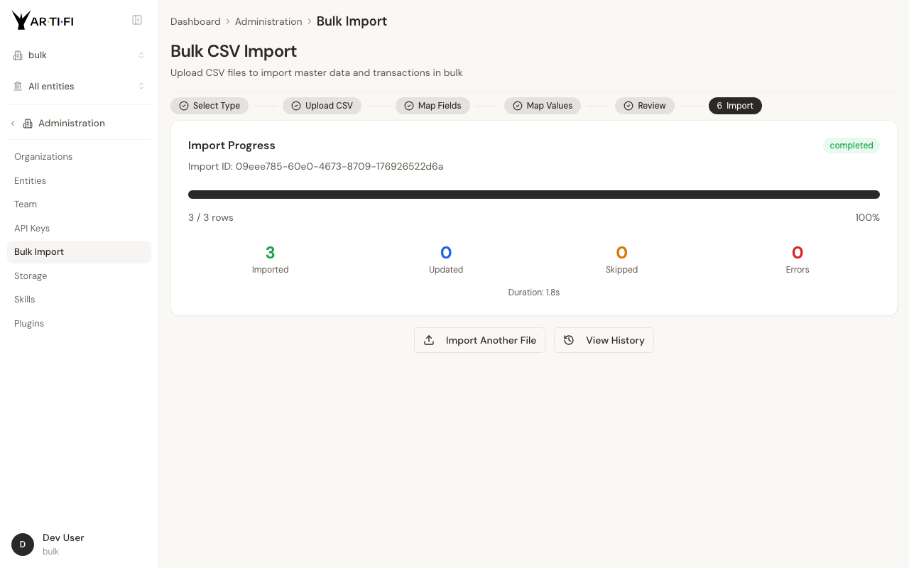 - Check the import history — Go to Administration > Bulk Import > History. All completed imports should show a green "Completed" status with zero errors.